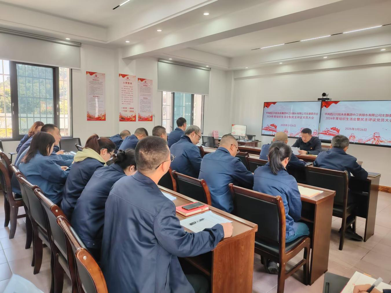 2025年3月26日,中江公司組織召開2024年度組織生活會暨民主評議黨員大會,會議由黨支部書記朱禹主持,支部22名黨員參加會議,公司供水部、污水部2名員工列席會議。